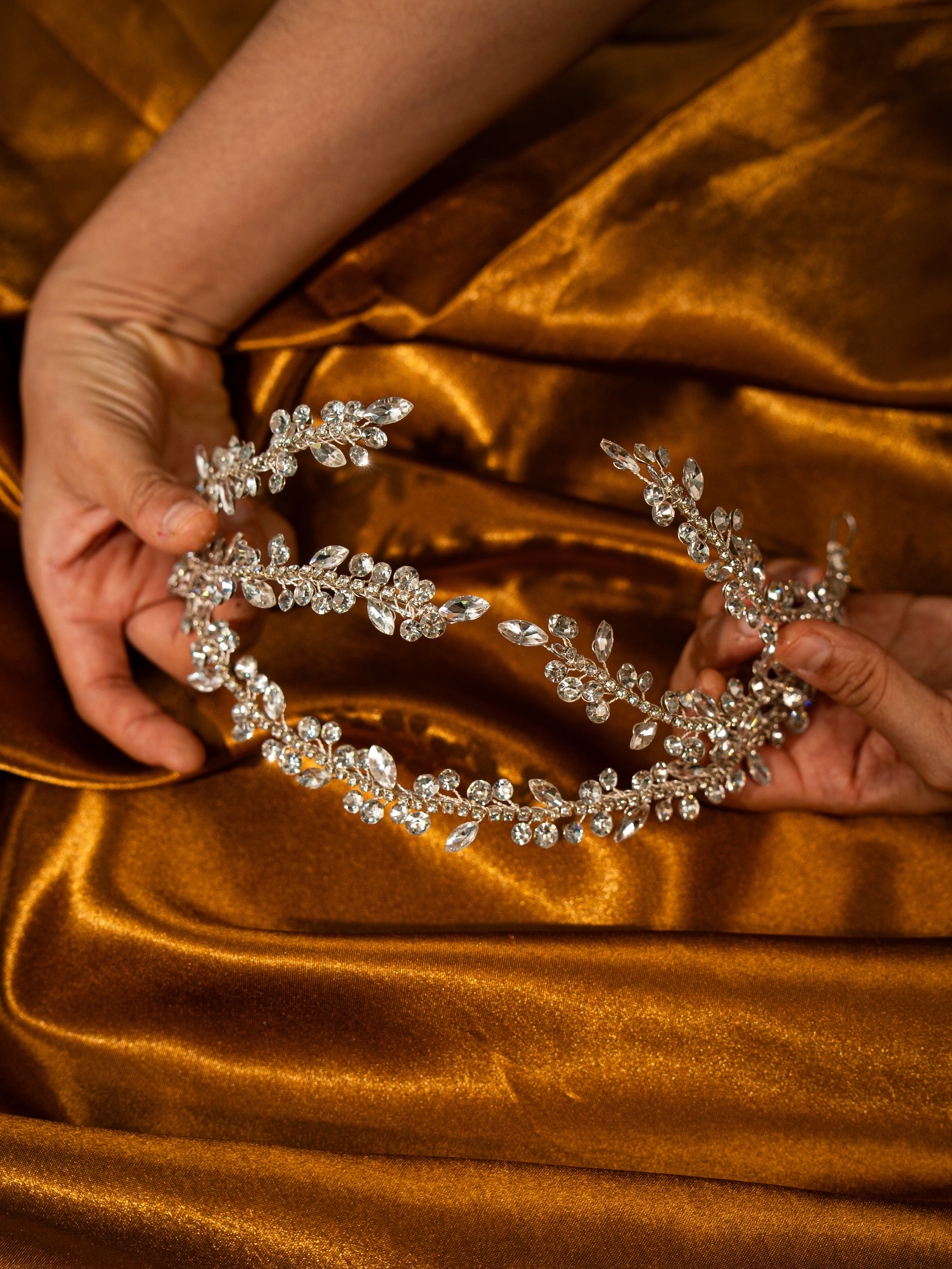 Guía flexible de cristales en forma de hojitas y círculos que abrazan la cabeza, con 32 cms de largo y el ancho es ajustable a gusto de la clienta. Se envía en plano y al ser flexible la puedes adaptar a la forma y medida de tu cabeza