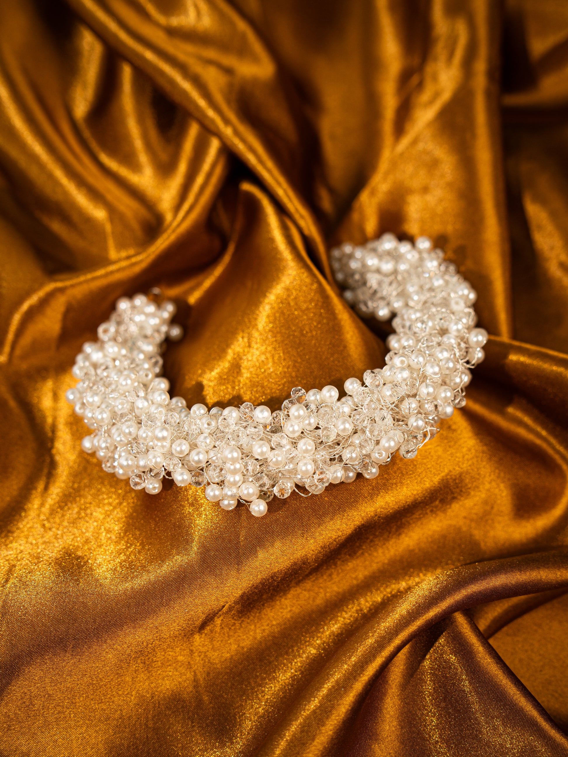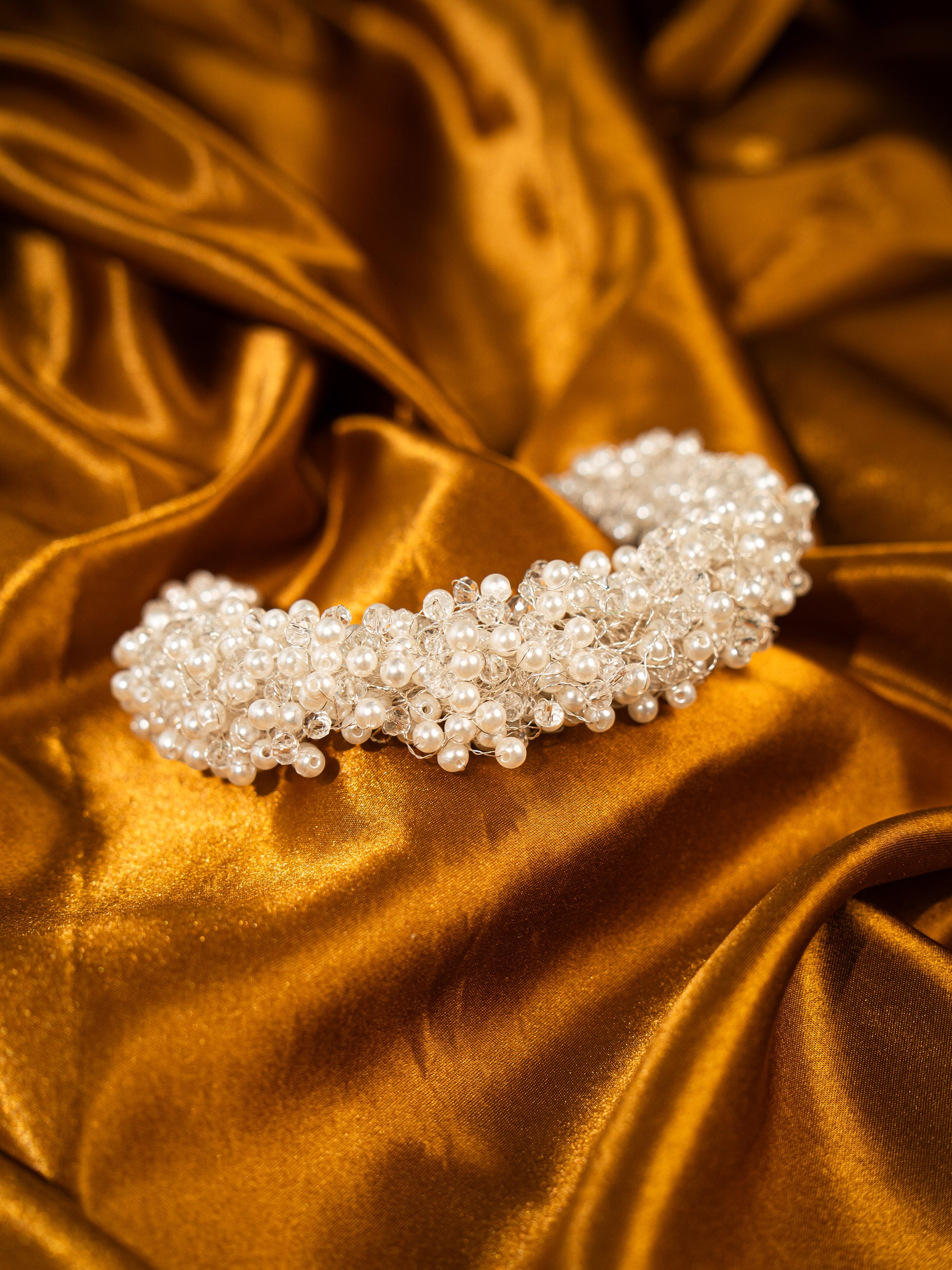 Tocado flexible de perlas y cristales. Aproximadamente 38 cms de largo y 3.5 de ancho.