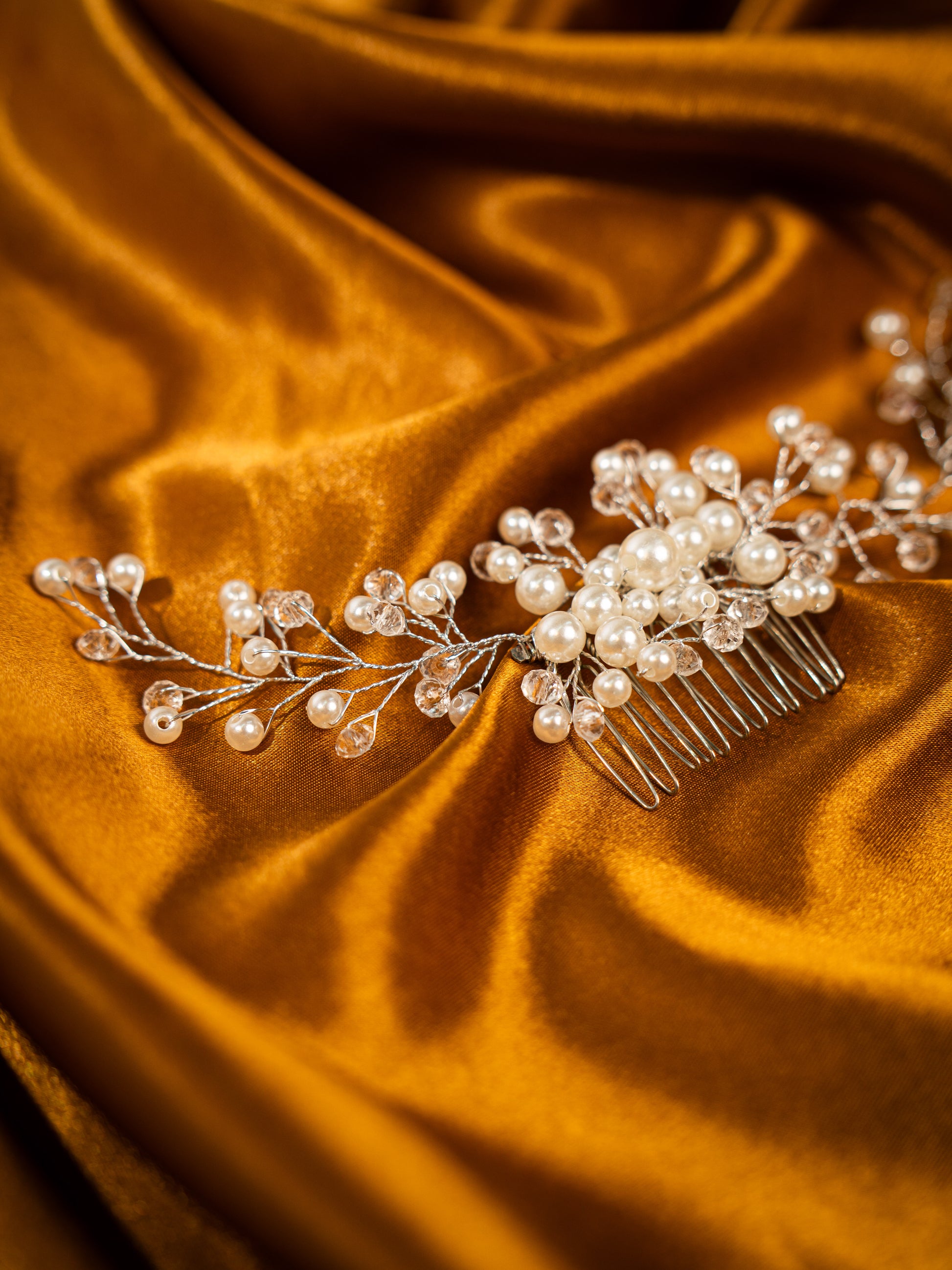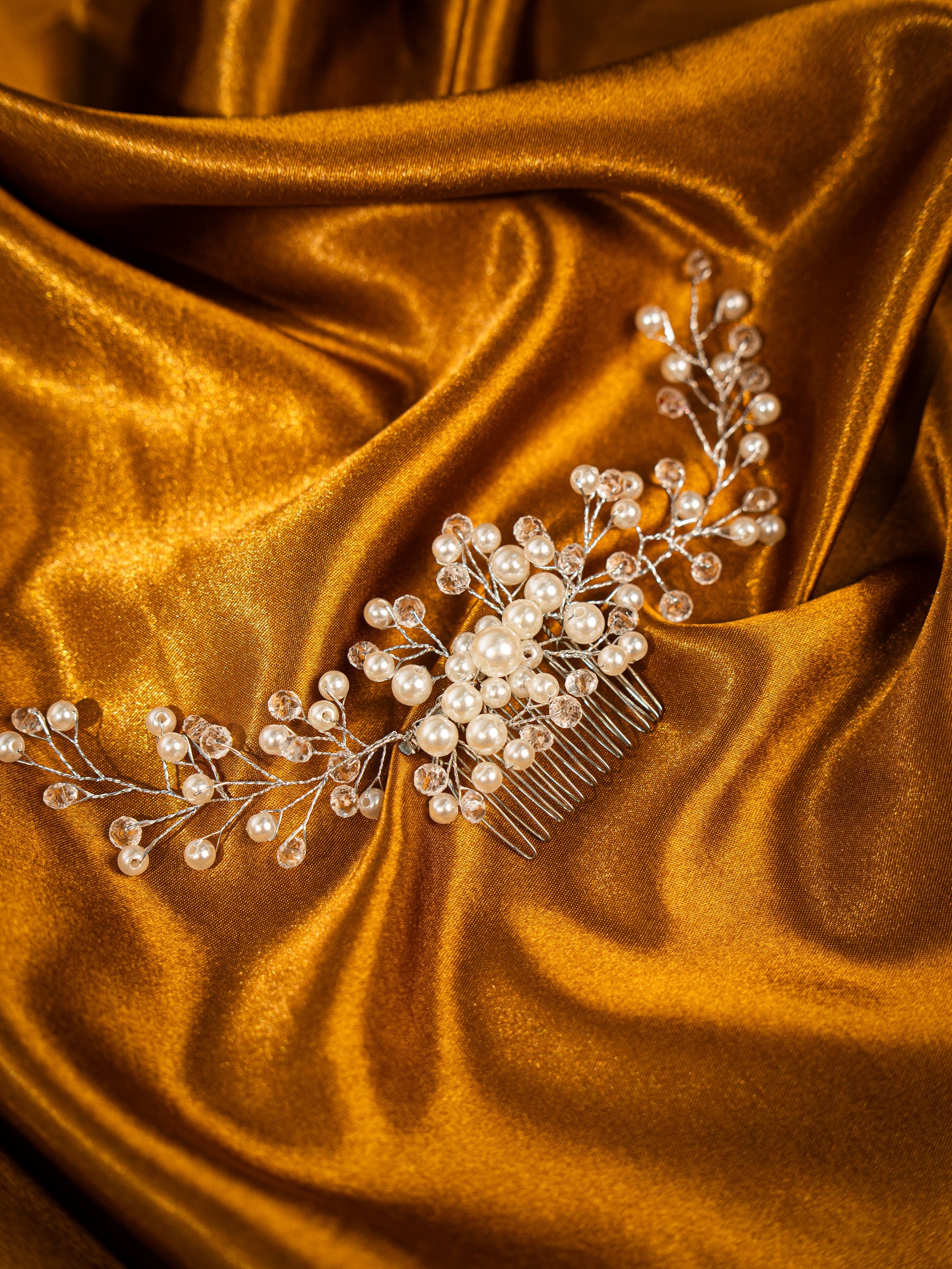 Peineta de perlas con cristales. Aproximadamente 22 cms de largo por 6 cms de ancho en su punto más alto.